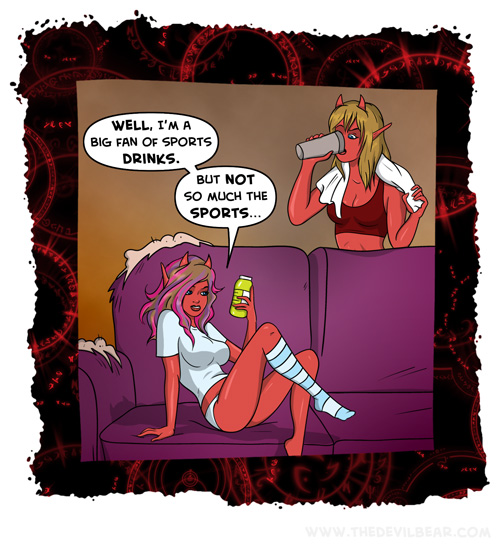 Electrolytes on March 11, 2020 at 12:01 am Chapter: ShortsCharacters: Helle Belle, Ursa └ Tags: daiva, devil, devilgirl, funny, gatorade, hell, lazy, sleep, sports, sports drinks Comment