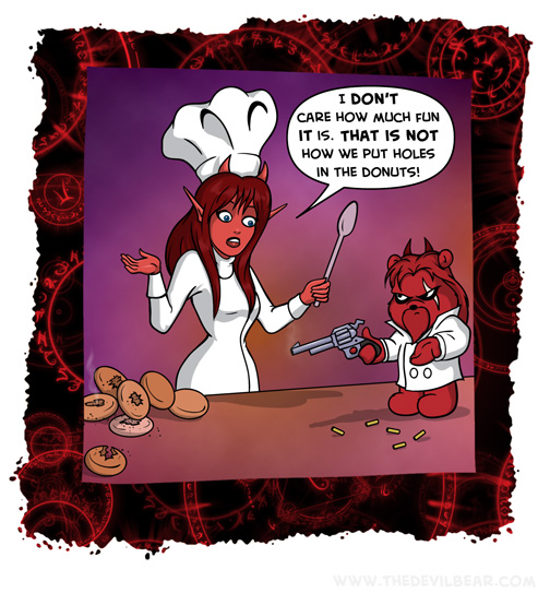 └ Tags: baking, bullet holes, cooking, daiva, devil, Devilbear, devilgirl, donut, food, funny, gun, hell, Teddy bear