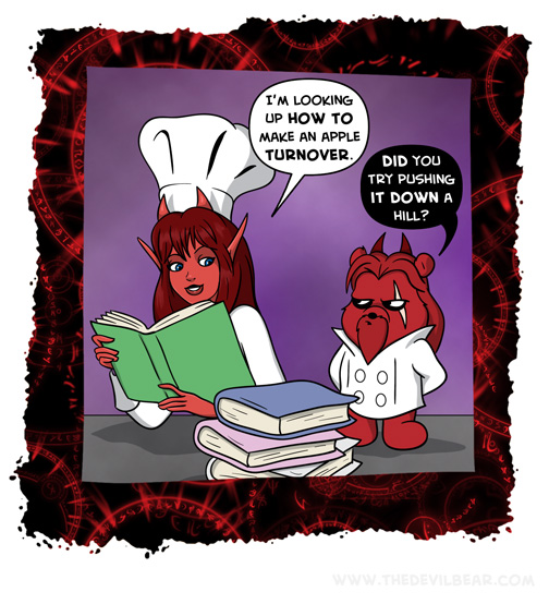 Recipe for disaster on May 4, 2021 at 12:01 am Chapter: ShortsCharacters: Bearalzebub, Cayenne └ Tags: apple, baking, comic, cooking, daiva, devil, Devilbear, devilgirl, food, funny, hell, humor Comment