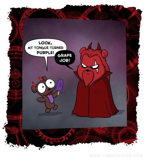 Popsicle on May 9, 2023 at 1:14 am Chapter: ShortsCharacters: Bearalzebub, Teddy bear └ Tags: baking, cooking, devil, Devilbear, food, funny, grape, hell, humor, popsicle, Teddy bear Comment