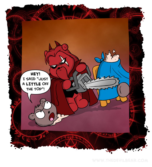 Cut short on November 8, 2021 at 12:01 am Chapter: ShortsCharacters: Bearalzebub, Teddy bear └ Tags: chainsaw, devil, Devilbear, funny, haircut, hell, humor, Teddy bear, torment, torture Comment