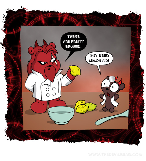 Looking sour on July 14, 2020 at 12:01 am Chapter: ShortsCharacters: Bearalzebub └ Tags: baking, bruised, cooking, devil, Devilbear, food, funny, hell, humor, lemon, lemonade, Teddy bear Comment