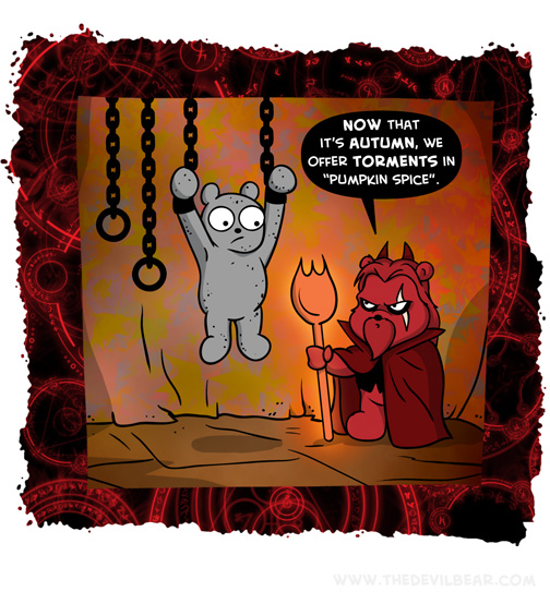 Festive on September 24, 2019 at 12:00 am Chapter: ShortsCharacters: Bearalzebub └ Tags: devil, Devilbear, hell, pumpkin, spice, Teddy bear, torment Comment
