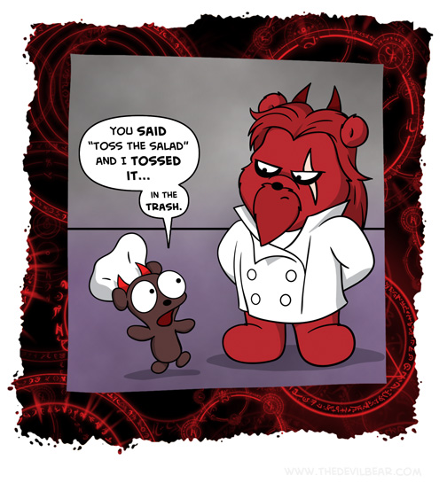 Tossed on February 6, 2024 at 12:01 am Chapter: ShortsCharacters: Bearalzebub, Teddy bear └ Tags: baking, cooking, devil, Devilbear, food, funny, hell, humor, salad, Teddy bear 2 Comments