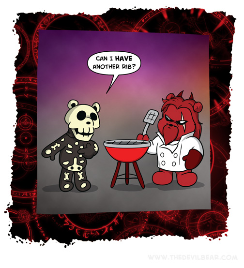 BBQ on November 30, 2021 at 12:01 am Chapter: ShortsCharacters: Bearalzebub, Teddy bear └ Tags: baking, cooking, devil, Devilbear, funny, hell, humor, skeleton, Teddy bear Comment