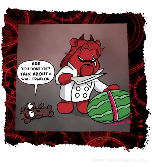 Impatience on September 19, 2023 at 12:01 am Chapter: ShortsCharacters: Bearalzebub, Teddy bear └ Tags: baking, cooking, devil, Devilbear, funny, hell, humor, Teddy bear, watermelon Comment