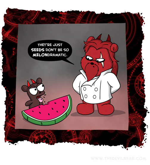 Hazards on August 22, 2023 at 12:01 am Chapter: ShortsCharacters: Bearalzebub, Teddy bear └ Tags: baking, cooking, devil, Devilbear, food, funny, hell, humor, seeds, Teddy bear, watermelon Comment